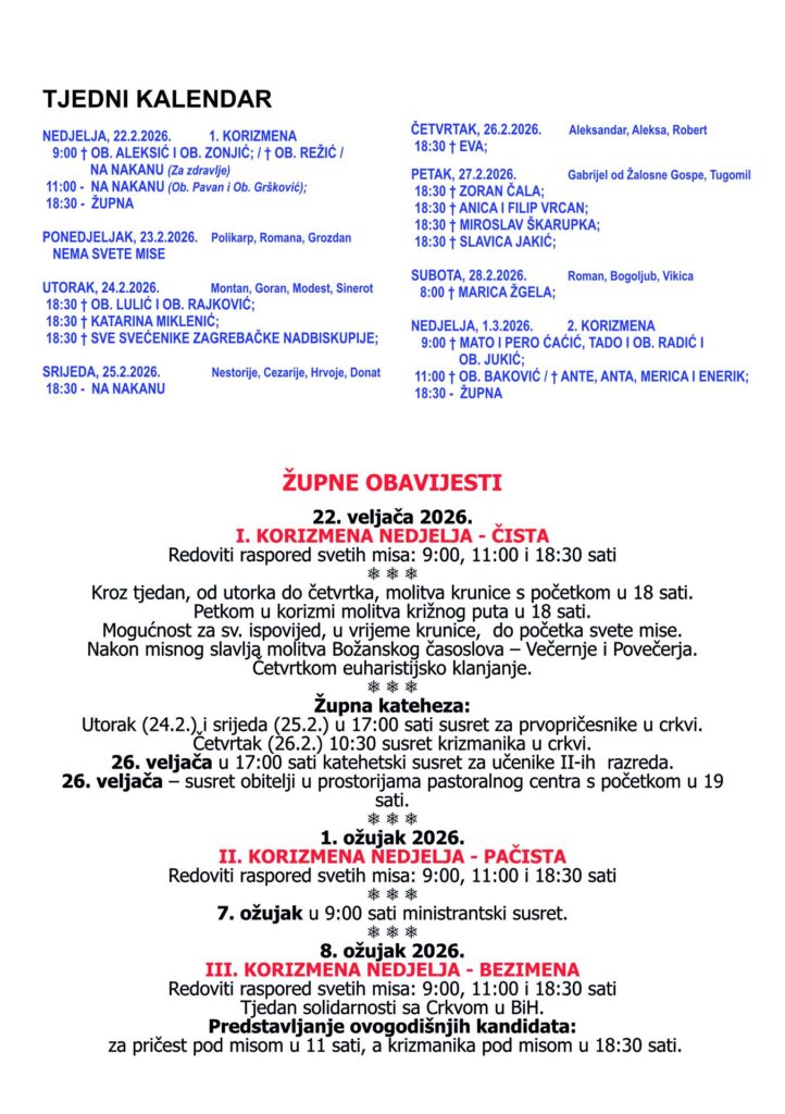 22. veljače 2026. Župne obavijesti: